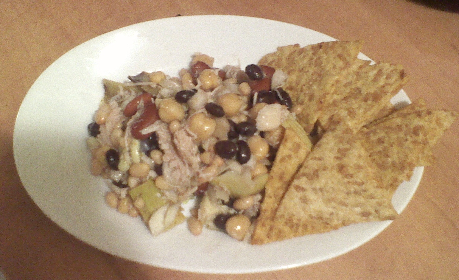 Shredded chicken, onion, and artichokes with garbonzo, black, small white, and kidney beans. Add some riceworks chips. You can make this a meatless meal too. So if you’re on the run and need a fast meal or if you want to have something for an appeitzer this is the dish for you. Full of fiber and flavor.