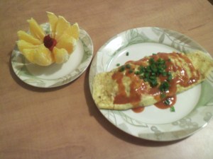 Who says you can’t have breakfast for dinner?  This is my Spanish Omelette: Onions, Green Peppers, Garlic, Bacon and Mild Cheddar Cheese topped with Enchilada Sauce and Green Onions.  On the side is a Naval Orange with a flower shaped Stawberry cut in the center.