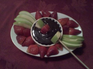 Nothing is better then some melted chocolate with strawberries and apples. Try this with any kind of fruit or even get creative and make some crepes. (Tip: If you dont have a fondue set, use a crockpot or pot to make the fondue)