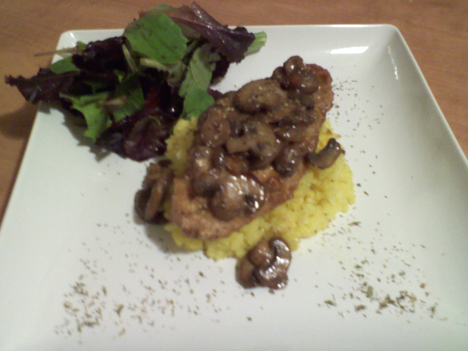 A popular dish is Chicken Marsala but instead of Pasta I decided to make it with Risotto with saffron. A side of mixed baby greens with dressing made from Balsamic Vinegar, Olive Oil and Garlic cloves.