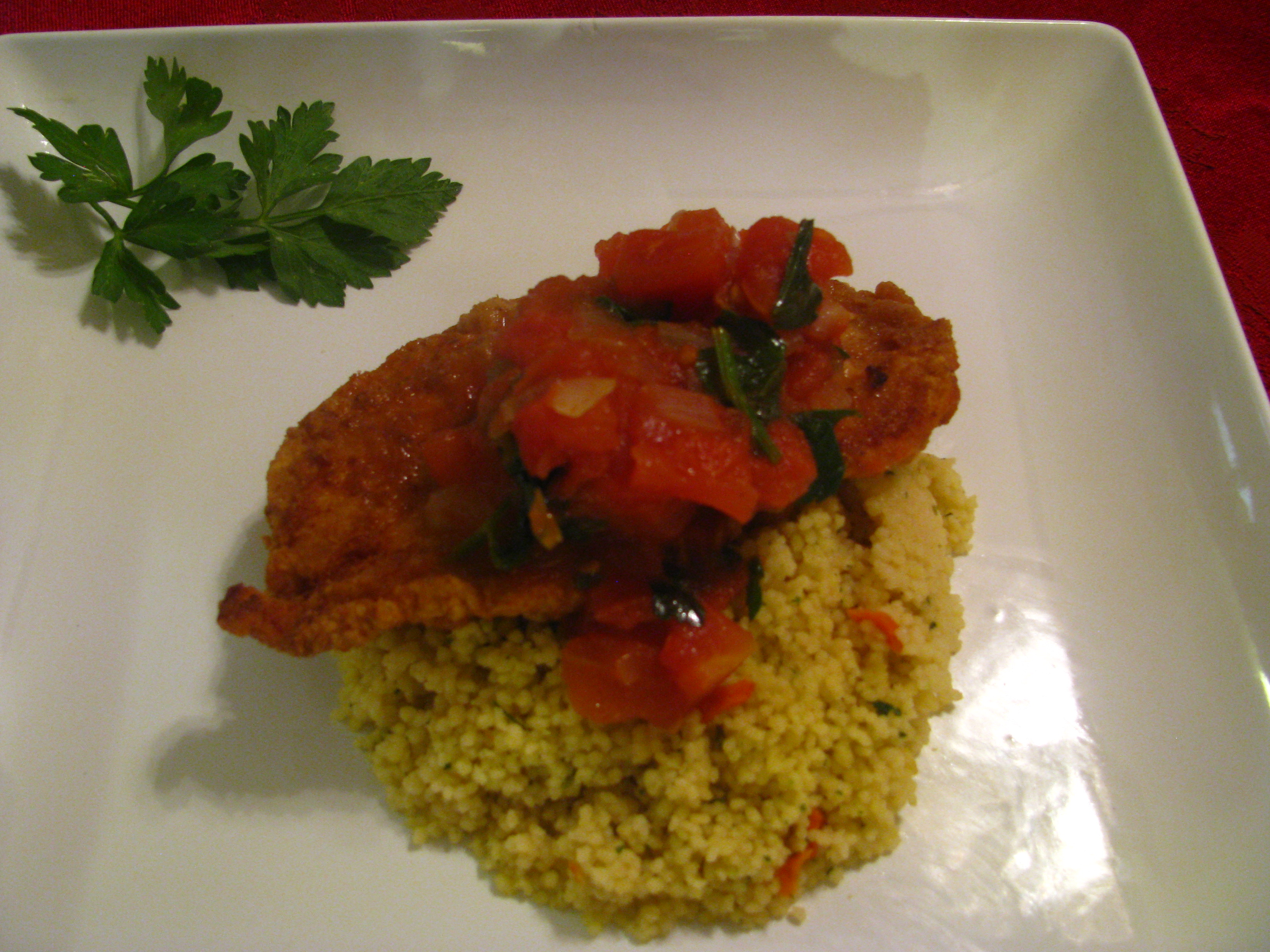 I took some chicken breast, dipped it in some egg and whole wheat flour.  Next, I placed it in a hot skillet with olive oil, drained it on some paper towels afterwards, and placed it on a bed of herbed couscous.  Finally, I topped it with fresh stewed tomatoes, onions and fresh parsley.  Another light Spring/Summer dinner.  Nothing like feeling light and having room for some dessert or coffee.