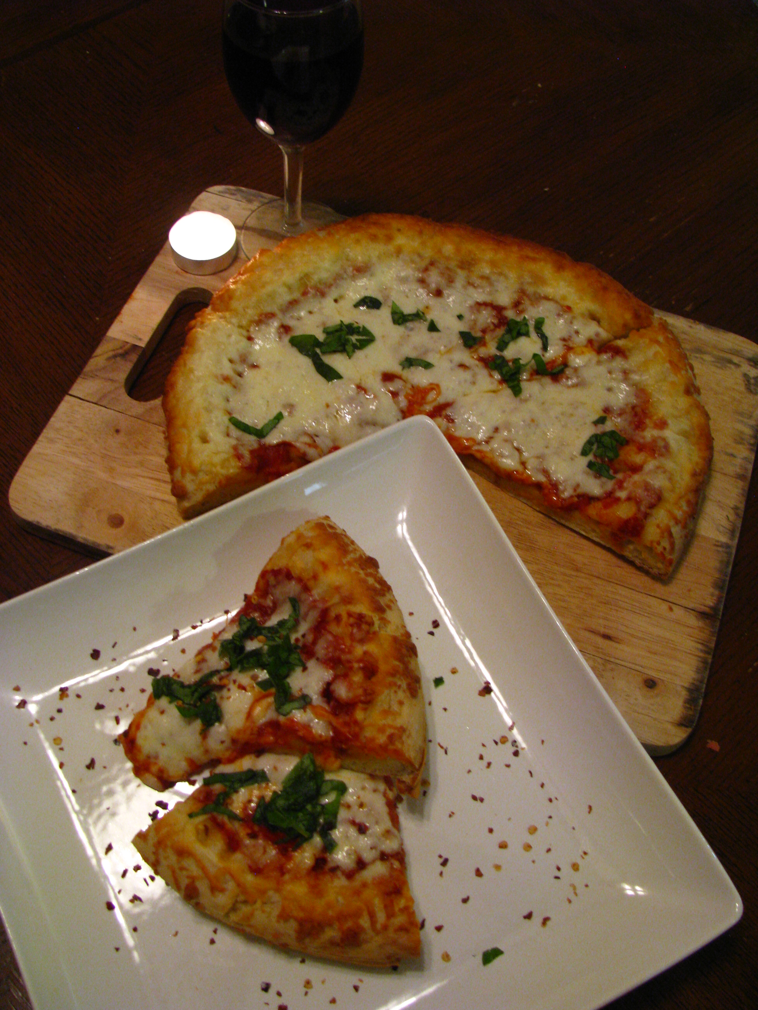 Tonight I decided to make a deep dish pizza in this new pan I got to make it. I’m a BIG fan of thin crust pizza but I guess we have to give the thick dough some LOVE too. I went to my local grocery store and picked up fresh frozen pizza dough placed it in the deep dish pan and then brushed it with some olive oil and garlic. Then I topped it with some fresh canned tomatoes, shredded mozzarella and basil. Super fast and easy only took about 20 to 25 min. This is the perfect accompaniment with a nice glass of red wine.
