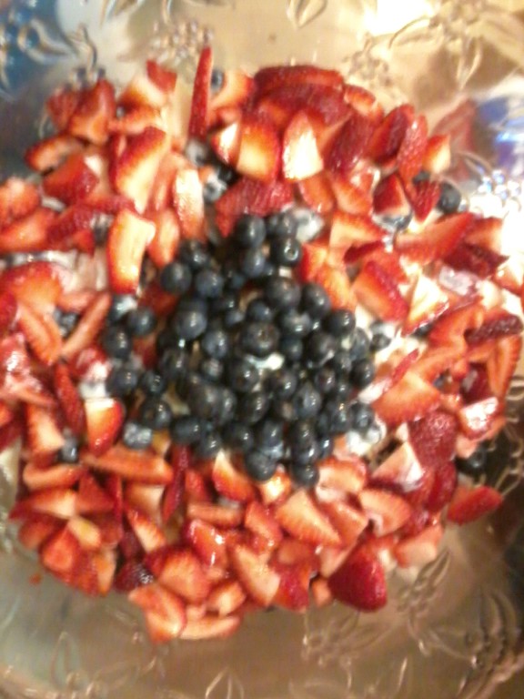 Happy 4th of July. I hope everyone is having a great and safe time with family and friends. I made a patriotic dessert that was a crowd pleaser. I took some Angel food cake (I took almond abstract with some sugar and water melted in a pot and brushed it on the cake), strawberries and blueberries. I also made my own cream cheese sauce (cream cheese, sugar and heavy cream). Everything gets layered. The dessert not only looked nice but was refreshing and delish. So if you have any parties coming up this weekend, this might be a dessert you would like to bring along. ENJOY!!