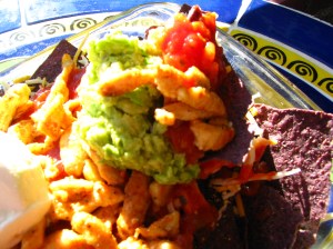 I picked up some chicken breast, Blue chips, salsa, avocados, mexican cheese blend and sour cream. I sliced up the chicken and cooked it up on a skillet. This is something really simple and takes no time at all. Put the chips, cheese, salsa and chicken in the oven for about 10 minutes or until cheese is melted. Then scooped some fresh guacamole and some sour cream on top and enjoyed. I know this isn’t the Grande Nachos, but you can create any kind of nachos; from chorizo to seafood as a topping just have fun with it. But most importantly enjoy eating it.