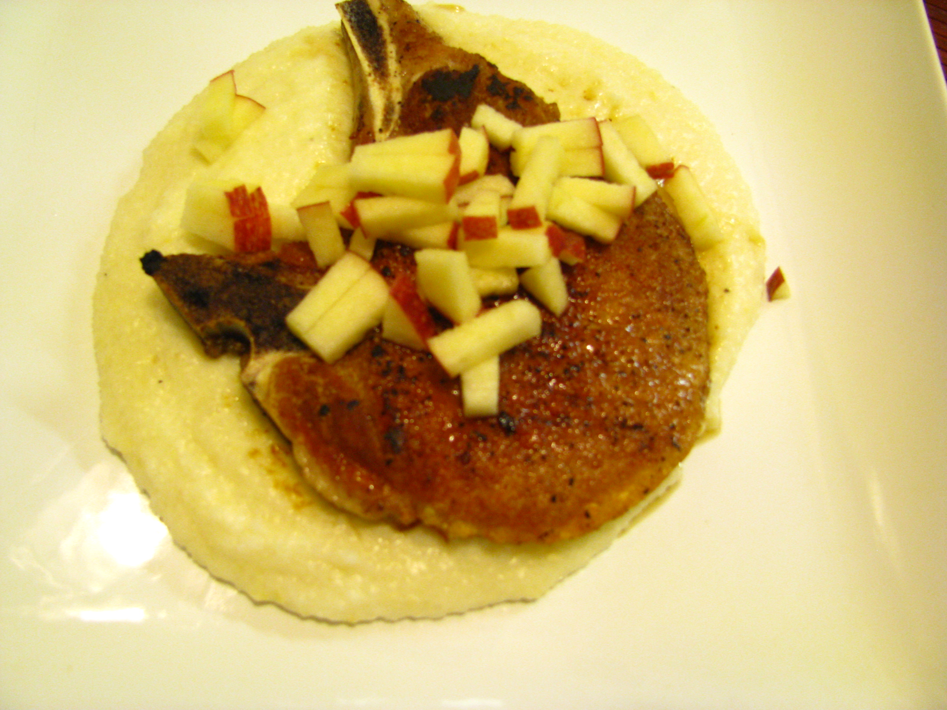 Grits in my opinion are over looked by a lot of people. Its such a great ingredient to cook with and get creative. The other night I decided to make some grits with Gruyere cheese topped with a nice golden pork chop and garnished with diced apples. This combo I think has been one of my favorites. The grits were so creamy and smooth with so much flavor and the apples just gave it that nice sweet balance. If you haven’t prepared grits before you should defintly give it a try. You can even make a breakfast with with cheese and bacon.