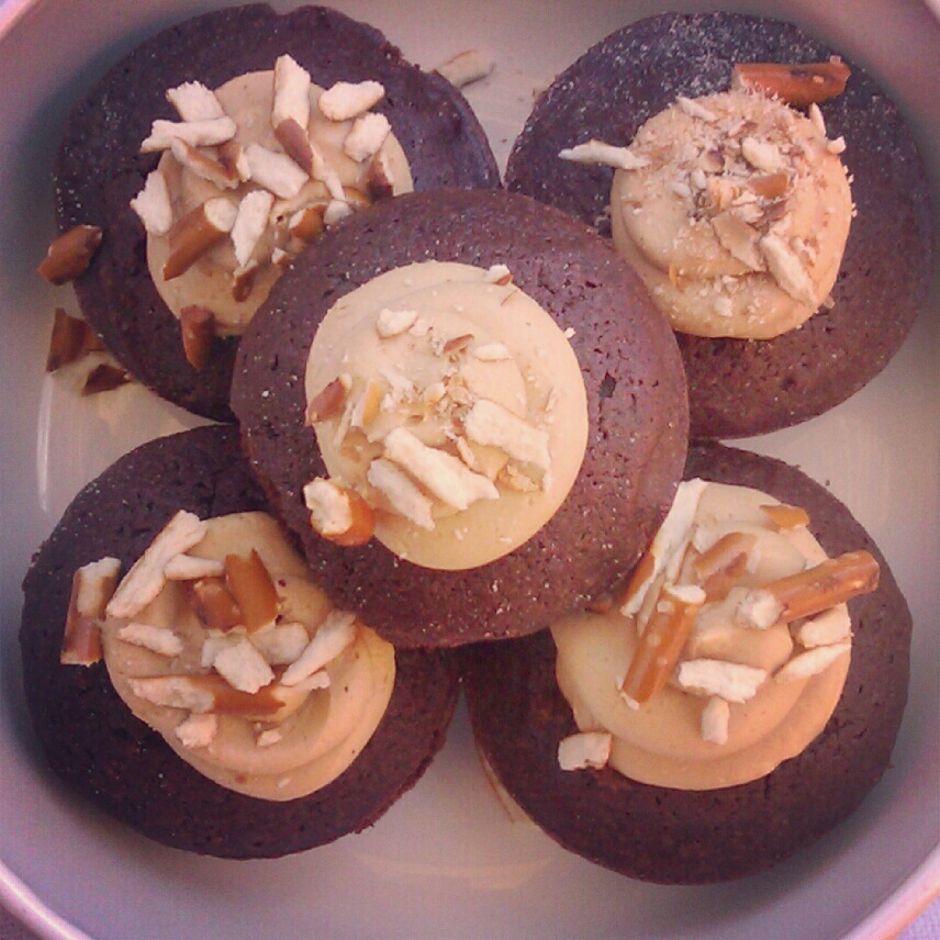 Using a small knife and cut a little circle around the brownie cup. I used a sandwich bag and filled it with the filling and cut the tip of the bag so it would be easier for filling the cups. You can put as much or as little topping as you would like. Top it with some crumbled pretzels sticks. Enjoy!