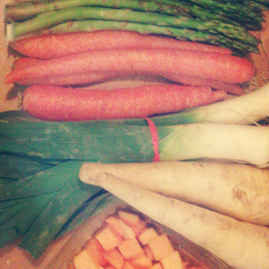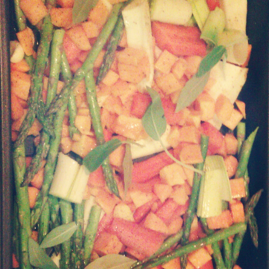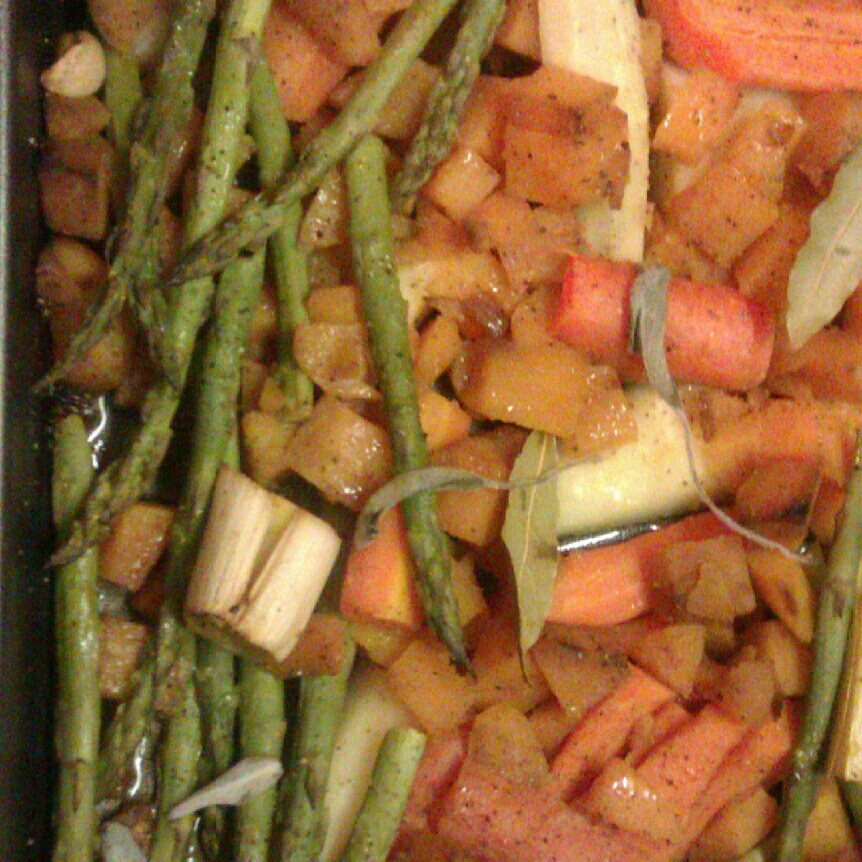 Wash and clean all veggies.  Chop and cube then place then in baking pan.  Season with Salt, Peppercorn, Olive Oil, Bay Leaves and Sage.  Roast for about 1 hour on 375 degree oven.  After done roasting place the veggies in blender (you will probably need to do it in 2 parts), Add Chicken stock as needed to blend.  Dump some in a bowl and repeat process.