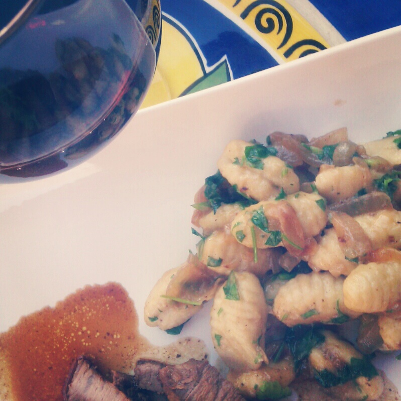 Another tip don’t get tempted to keep turning the steak, and one last thing.  Wait a couple of minutes before cutting into that delicious steak.  Reason beginning is you don’t want to lose all those juices.  This is a nice cut of Sirloin Steak I cooked it up right on my Anolon grill skillet, and to go with I made some Gnocchi with caramlized onions and some parsley.  Enjoy.