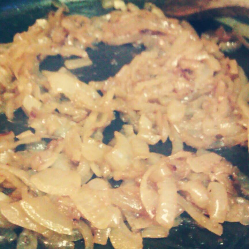 Chop up some onions.  In a medium size skillet on medium heat add 2 tablespoons of Olive oil and Butter, add onions, add some salt and pepper and keep moving them around.  If they start to brown, quickly lower heat and keep moving them.  They will start to caramelize, should take about 10 to 15 minutes or so.  After caramelized, add the Marsala wine.  This will give it a little more sweetness. Put aside