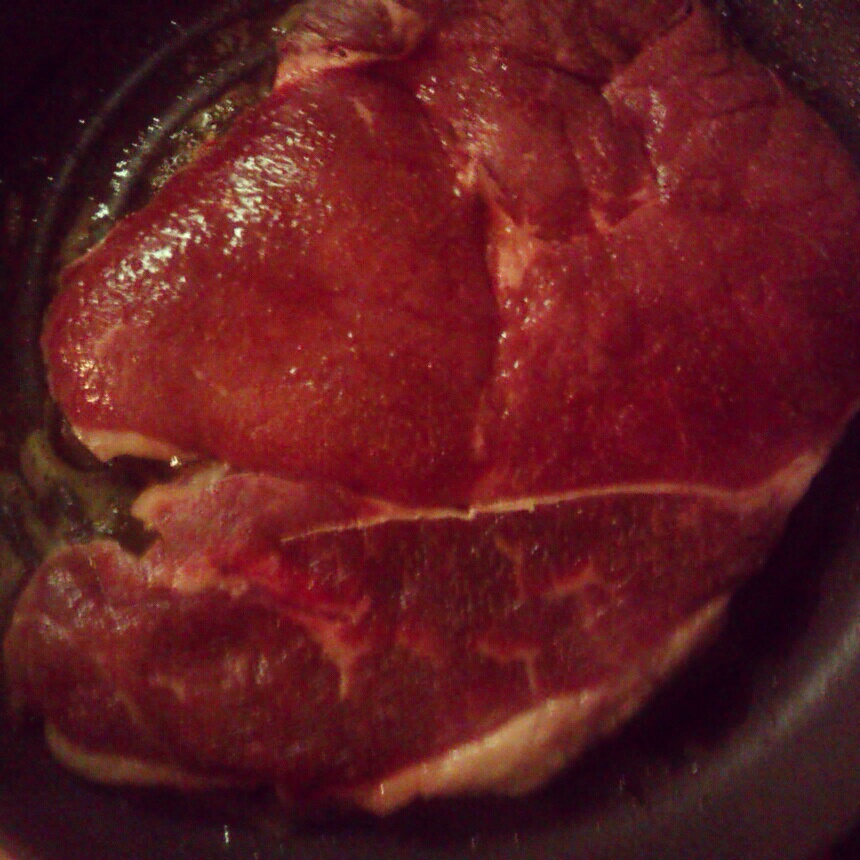 Meanwhile get a skillet nice and hot.  Add 2 tablespoons of unsalted butter and your Sirlion Steak, don’t get tempted to turn, let cook for about 5 minutes on each side (more or less depending on how you like your steak).  After its done let sit for about 5 minutes or so. Then slice.