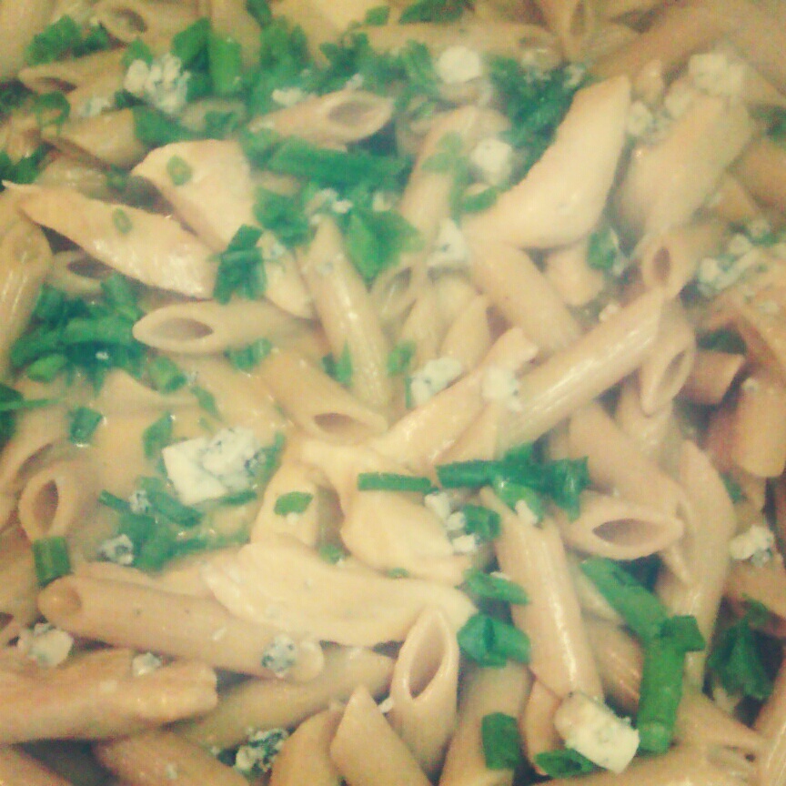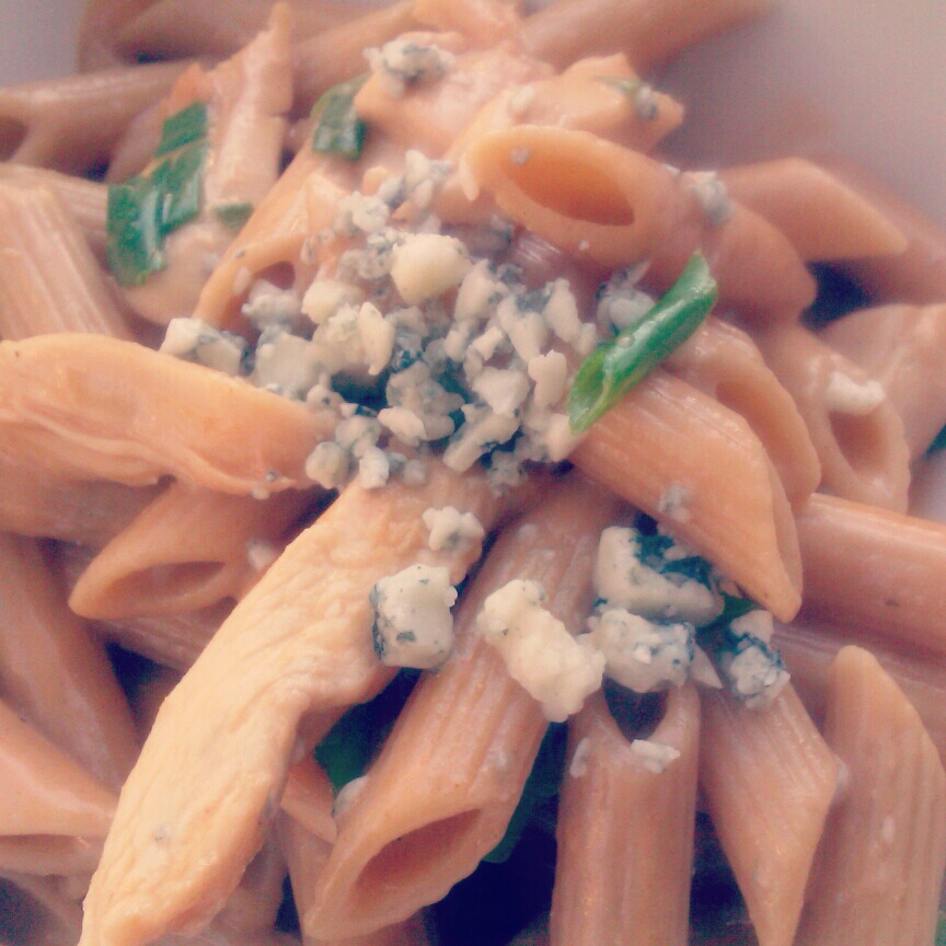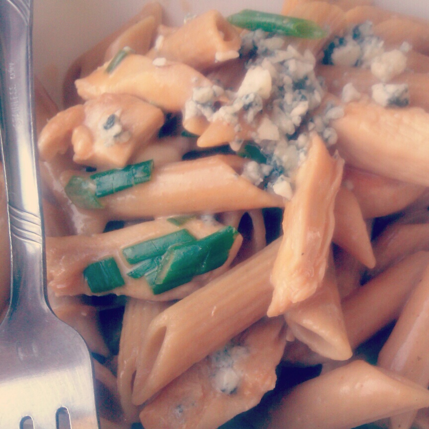 Clean, Cut chicken into strips or cubes, season with salt and pepper. Add Olive oil to a skillet on Medium heat. Add chicken and cook until nice and golden. Should take about 6 to 8 minutes. Add Ranch dressing and Buffalo Sauce, cook for about 2 minutes or until begins to bubble. After that add penne and green onions right into the skillet and mix everything together. Plate on to a nice dish and add blue cheese crumbles. If you would like you can place this on a baking dish and bake for about 10 minutes. Once done place on table and let the enjoyment begin.