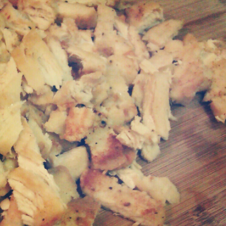 Meanwhile chop up cooked chicken and add into the skillet.  Toss everything together.  Add Water or Stock at this point to left up those drippings. Toss everything together add minced garlic and cook for another 5 minutes.