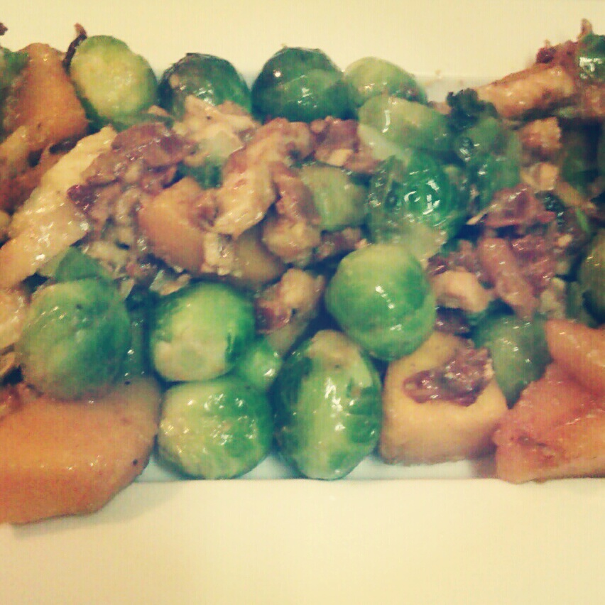 Season Chicken with salt & pepper. Place 1 cup of flour on a plate and dip the chicken on both sides, put aside.  On medium high heat add olive oil and cook chicken until nice and golden on both sides.  Place to the side. In the same skillet add chopped bacon, cook until nice and crispy(drain some of the fat if any from the bacon) add Brussel Sprouts and Butternut Squash.  Place lid on and cook for about 8 to 10 minutes (Stir halfway through, try the brussel sprouts and butternut squash to see if they are to your tasting.  This is the fun part about being the cook).