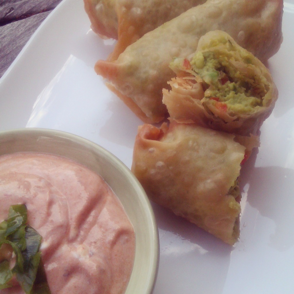 Egg rolls have come a long way.  They have become a popular food to create even in your own kitchen.  You can wrap up anything from meats, cheeses, veggies to even fruit.  Go ahead and give it a try next time you host a party or bring it to a friend’s place as a treat.  I am in love with guacamole and I have seen people make these but everyone makes their guac differently, so I figured I would give it a try with my own.  To go along with the egg roll I made a Chipolte Sauce. If you would like you can also add some queso fresco to the mix.