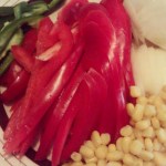 In the same skillet/cast iron heat up the remaining 2 tablespoons olive oil and butter fry the onions, bell peppers, jalapeno and corn until crisp-tender with some salt and pepper.