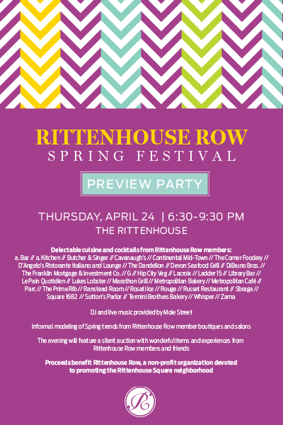 Tickets are $75 per person for general admission and $125 per person at the Patron level and can be purchased in advance by visiting, http://rittrow.ticketleap.com/2014previewparty/. Those who purchase Patron level tickets will be given access to the VIP Area at the Rittenhouse Row Spring Festival.