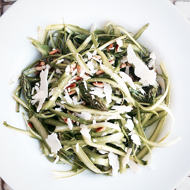 Seems like everyone is still on the kick on eating healthy this year. I have been trying to add more raw veggies into my diet. This asparagus salad has become a favorite in my house. Not only does it look beautiful, but it tastes amazing and refreshing. The salad goes great with a side of homemade soup. You can top also it with pretty much anything. I used shaved parmesan and toasted pine nuts.  Enjoy!