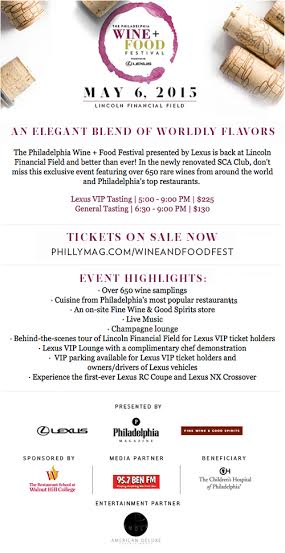 This year’s event will be held May 6th at Lincoln Financial Field. A great reason to attend what’s sure to be a delicious bash, a portion of all ticket sales benefits the Children’s Hospital of Philadelphia. For more information or to purchase tickets visit http://www.phillymag.com/wineandfoodfest/