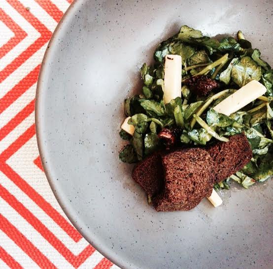 In a large add juice of the Orange, olive oil, salt & pepper and whisk. Next add watercress, dates, cheese and toss together with dressing. Set aside.