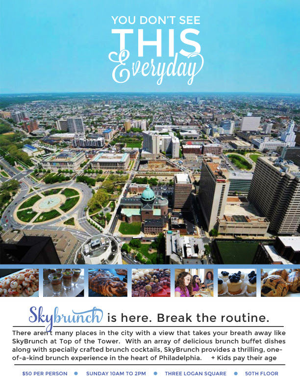Having your head in the clouds doesn’t mean you’re not grounded — oh yes we did — and that’s why the Top of the Tower will donate a $1 from every cover at SkyBrunch to Philadelphia’s Clean Air Council, while inviting guests to match the donation, if they so choose, with a line on each guest check. Tweet: #SkyBrunch