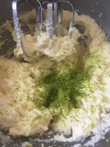 In large bowl, cream butter and sugar for 2 minutes until light and fluffy. Add eggs, vanilla, lime juice, and lime zest and stir to combine.