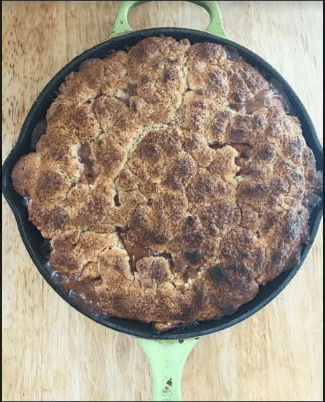 Next take a cast iron add some butter to sauté the marinated peaches on medium to high heat. Sauté for 5 minutes remove from heat. Finally add your dough with a tablespoon or ice cream scoop throughout the top of the peaches. Sprinkle with additional sugar and cinnamon if desired.