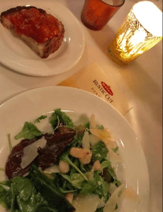 The event had some delicious wines to pair up with dinner. Appetizers started out with Arancini balls topped with Bertolli® Rustic Cut™ Roasted Garlic Marinara with Garden Vegetables Sauce , mini Meatballs topped with Bertolli Rustic Cut Pasta Sauce Marinara, and dates wrapped with prosciutto. These all were very delicious. Now let’s get to dinner.