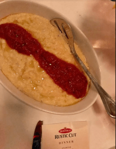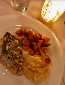 For starters we enjoyed a Tuscan salad and rustic bread topped with Bertolli® Rustic Cut™ Pasta Sauces with a Pinot Grigio. The main course was a family style Roastes Branzino, Chicken Cacciatore made with Bertolli® Rustic Cut™ Pasta Sauce Sweet Peppers and Portobello Mushroom (delicious), Cavatelli tossed in Bertolli® Rustic Cut™ Pasta Sauce Roasted Garlic, mushrooms and heirloom tomatoes topped with Parmesan cheese (I could have eaten the whole bowl, haha) and finally for the table was a creamy marscapone and Parmesan polenta with Bertolli® Rustic Cut™ Pasta Sauce Spicy Marinara. The wines paired for dinner were Chianti and Chardonnay.