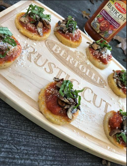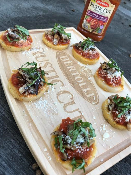 Cut the store bought polenta into round bites. Top with Bertolli Rustic Cut Roasted Garlic Pasta Sauce, sautéed mushrooms and Parmesan cheese. Place in the oven at 375 F degrees for about 10 minutes. Remove from oven top with Basil and serve.