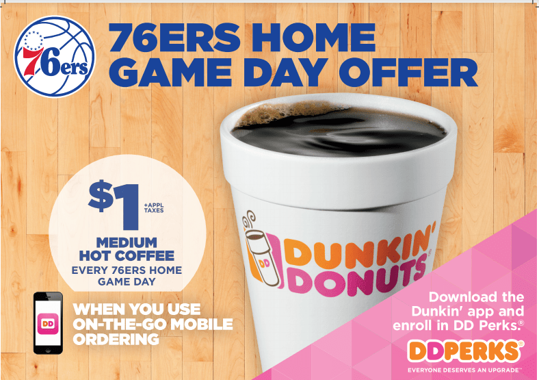 Sixers fans can score a $1 medium Hot Coffee on all Sixers home game days when they use On-The-Go Mobile Ordering in the Dunkin’ Donuts app