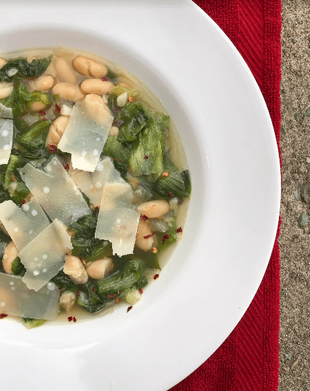 Heat 2 tablespoons of olive oil in a large pot over medium heat. Add onions cook for about 3 minutes until translucent, add garlic and saute until fragrant, about 30 seconds. Add the escarole and saute until wilted, about 2-3 minutes. Add salt and pepper, Add the chicken broth, beans, and Parmesan cheese rind. Cover and simmer until the beans are heated through, about 5 minutes. Serve and garnish