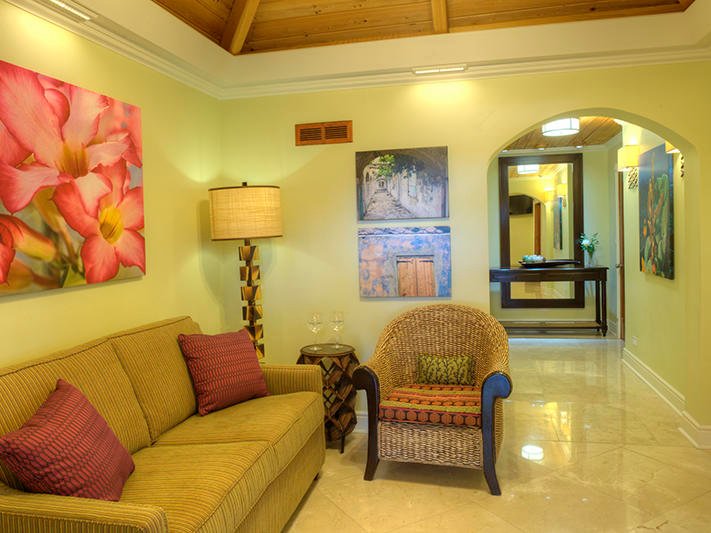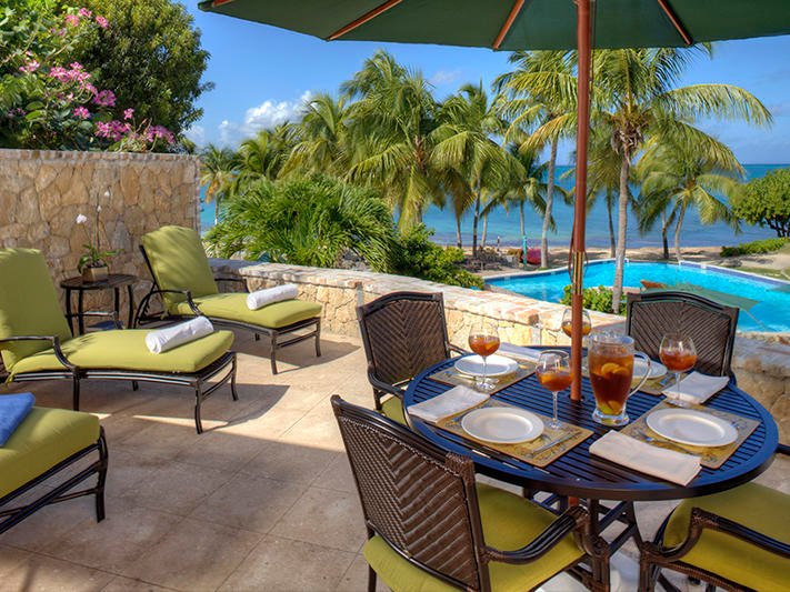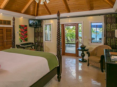 is a two-bedroom multi-purpose suite, located above the Grotto beach and pool, features two master bedrooms, one with a four-poster King bed, and bath with a whirlpool tub and a separate shower. The second bedroom has a King four-poster bed and a full bath. Both share an expansive balcony overlooking the pool and the sea. There is also a separate sitting area with a pull-out couch. A kitchenette, a dining area and another sitting area with a pull-out couch and a third full bath offer convenience and options for larger families. This suite can also connect to the Frigate Suite and Frigate Room.